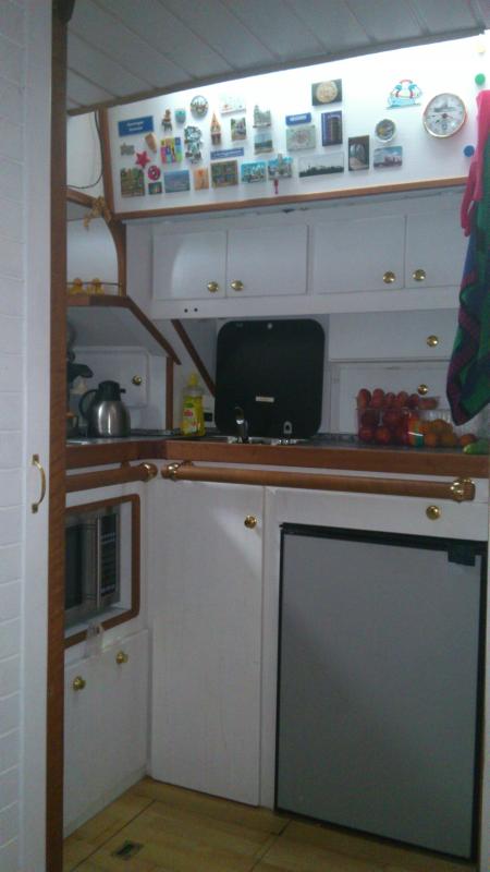 unten links Backofen/Magnetron (230V Landstrom oder Inverter); unten rechts der Kühlschrank (Kompressor, elektr. 24V / 230V)