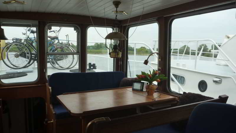 Tisch mit 'Rundumsicht'. Die Lehne der vorderen Bank kann umgeklappt werden, so dass man hier auch in Fahrtrichtung sitzen kann.